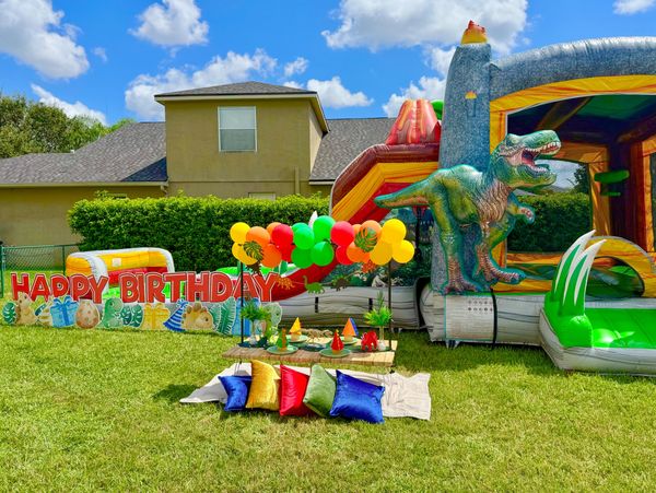 Dinosaur themed picnic, bounce house/slide combo, yard display, and slumber party. $785