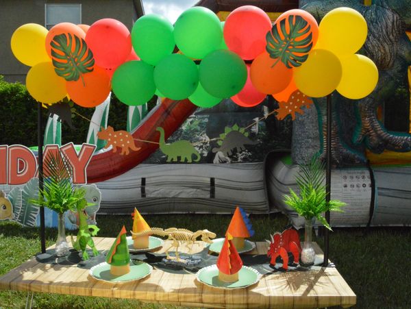 Dinosaur themed picnic, bounce house, yard display, and slumber party. $685